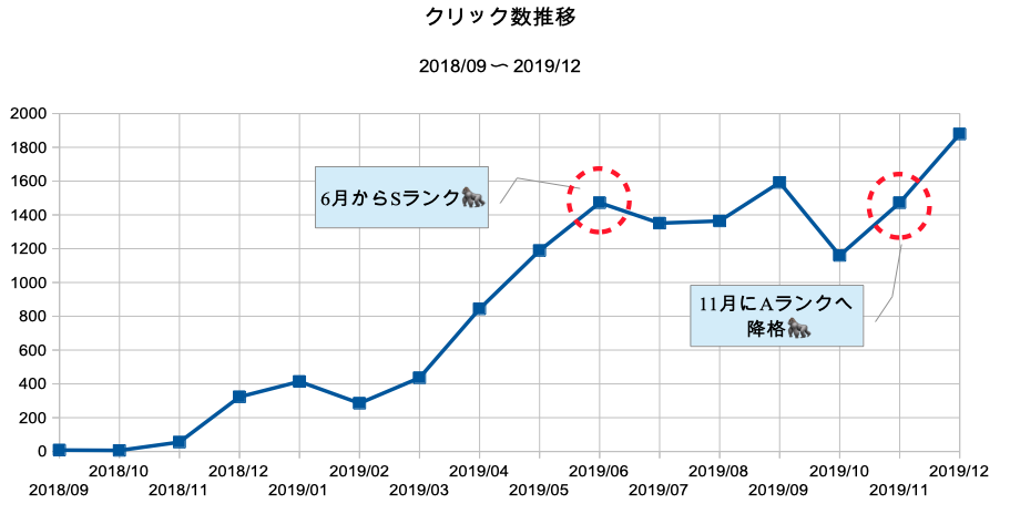 - 平均値から、「毎月最低でも1,400クリックを目指せばSランクが見えてくるかも」